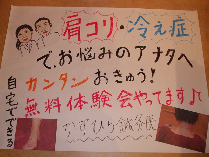 ポスターにも書いてますけど、このお灸は自宅でもカンタンにできます。治療も大切だけど、予防も大切。お灸で健康増進していただきたい!そんな私の想いで、当日は無料体験していただけるように準備しています。