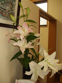 院受付のカサブランカ&オリエンタルユリが開きました