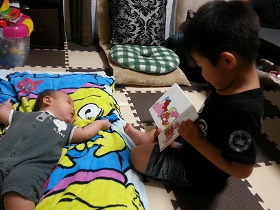 兄夫婦の子供に、本を読んでいる我が子。おぉ~、そんなことできるようになったんやぁと感心していたんですが、息子は「さ」と「ち」の区別がつかないようで、おかしな日本語になっていました・・・