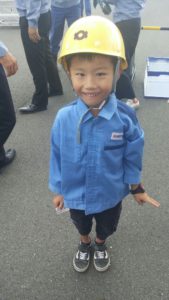 体験コーナーで、関西電力のユニフォームで高所作業者に乗せていただきました。「パワーウィズハート!」
