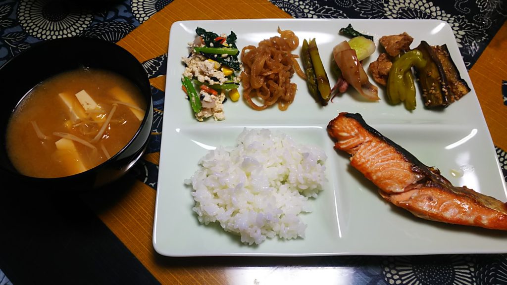 因みに、ファスティングダイエットを始めてから、食事は上記のような感じにしています。恭子先生に常備菜を作ってもらってます。そこから好きなものを取って食べる。メインは魚か豆腐です。