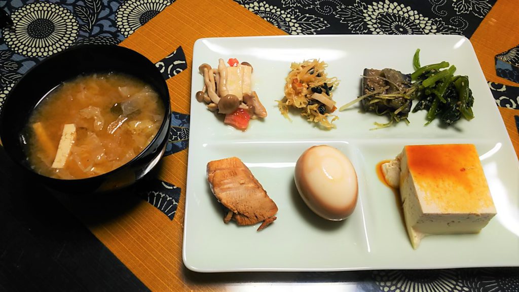 本日の朝食。冷奴(ねぎくらいかけろよっ)煮鶏 煮卵 ほうれん草ゴマ和え ナスと水菜のゴマ味噌焼き わかめとキャベツのナムル風サラダ トマトとキノコのマリネ 白菜と豆腐とわかめの味噌汁
