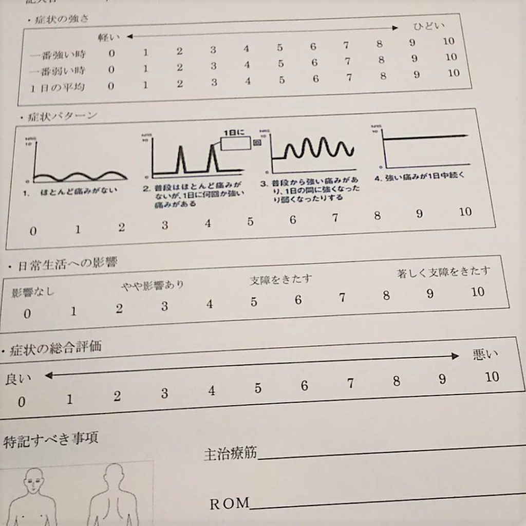 現在、自分の症状がどれくらいひどくて、どれくらい日常生活に支障をきたしていて、どんな症状の現れ方なのかなど、いくつかの項目を点数化、私たち治療側は、症状が現れている部分、主に治療する(した)部分、関節可動域などを記録していきます。