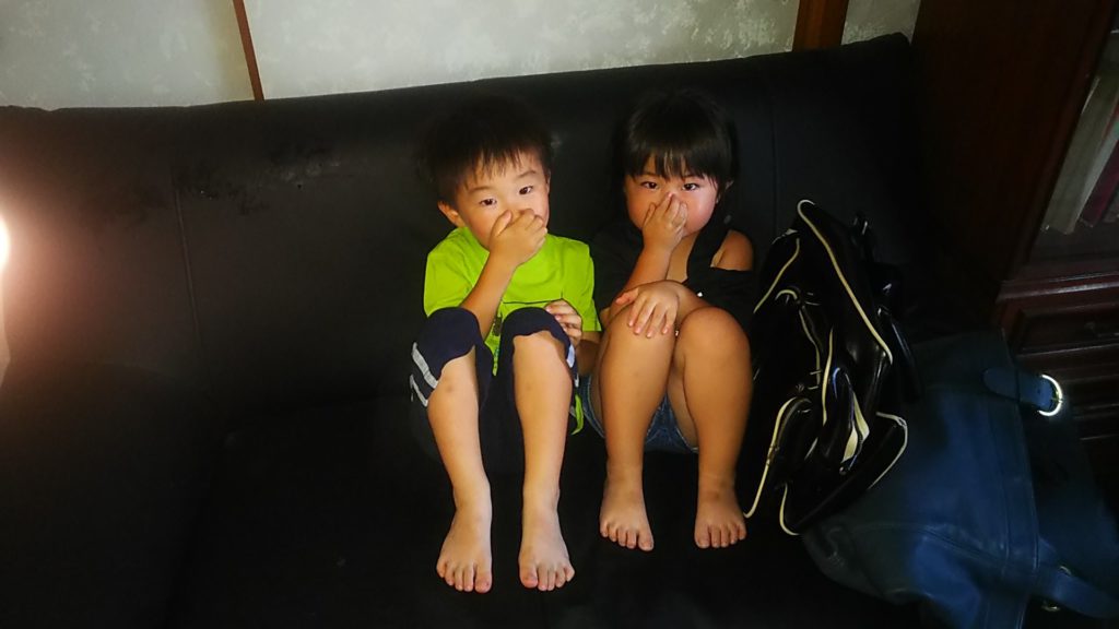 子供たちがおとなしくしているはずもなく・・・走り回るので、「静かにしてないと、今夜のお寿司はなしや!」というと、このポーズをしていました。