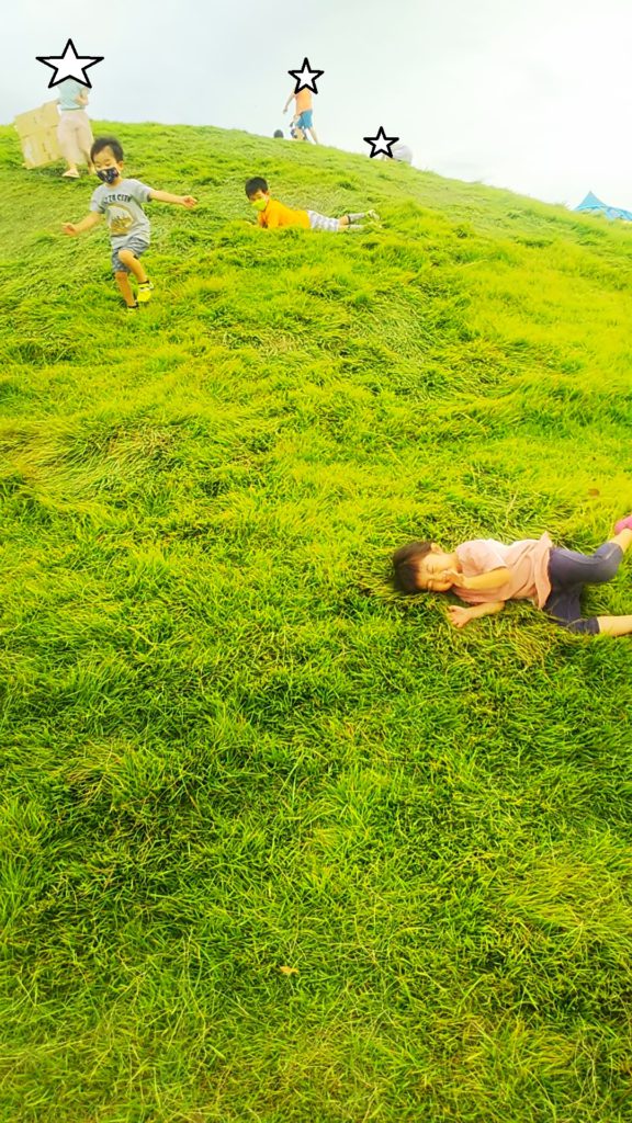 芝生の山もあります。走ったり、転がったりする3人。この後、3人が別々の方向に走って行ってしまい、取り残されるおっさん1人・・・
