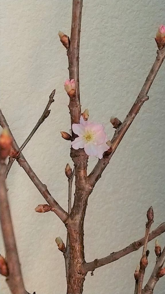 院受付の桜のつぼみが1つだけ開花しました!