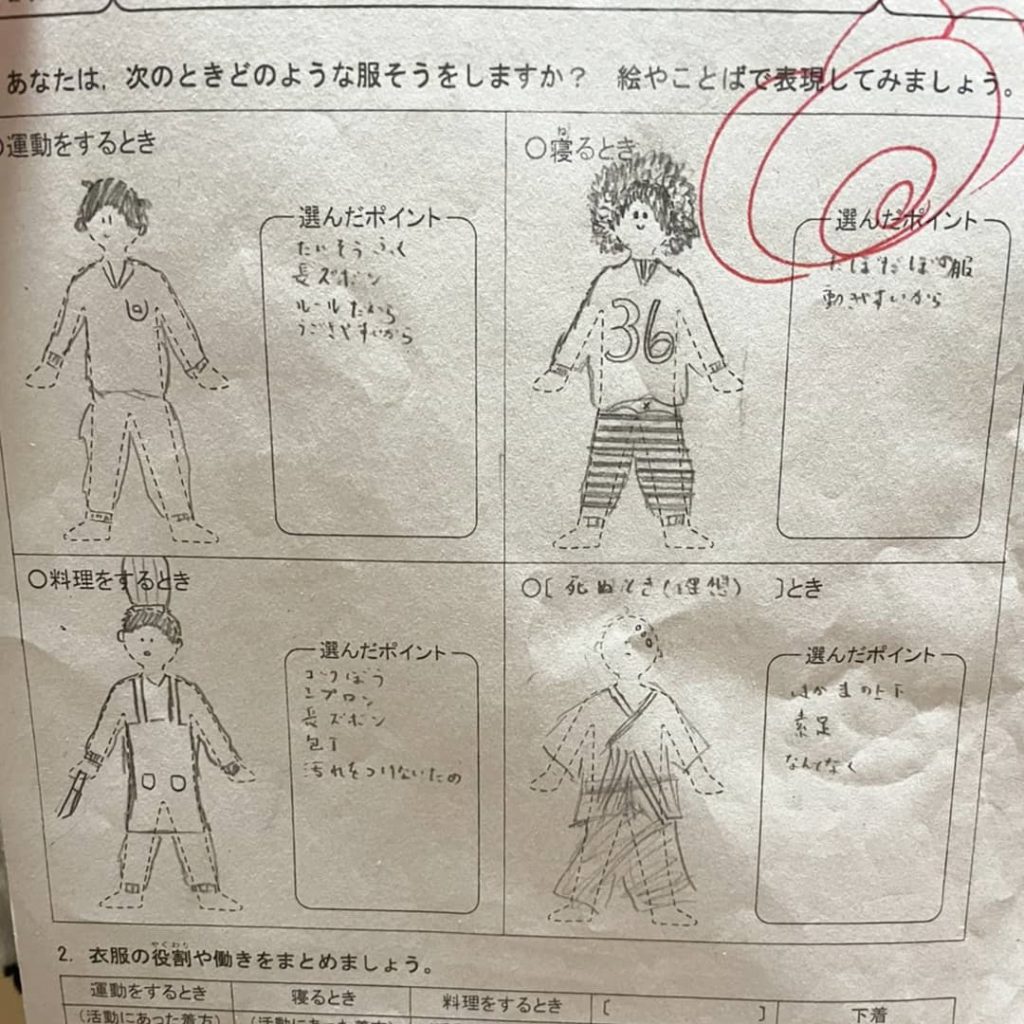 息子のプリントには、「〇〇なとき」という、自分で自由に場面を設定し、それに合った服装を記載するという箇所がありました。