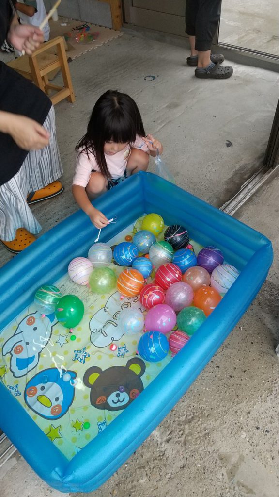 ヨーヨー釣り&スーパーボールすくい。数が少なかったので、全部釣ったりすくったりした後、プールに返却・・・笑 何回でも楽しめる制度です。