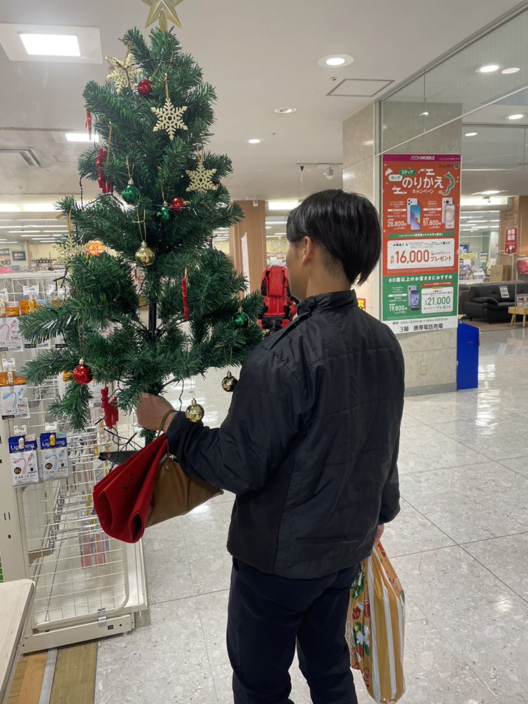 ショッピングモール内をクリスマスツリーを持って歩くおっさん。しかも嬉しくてちょっとテンション高め。