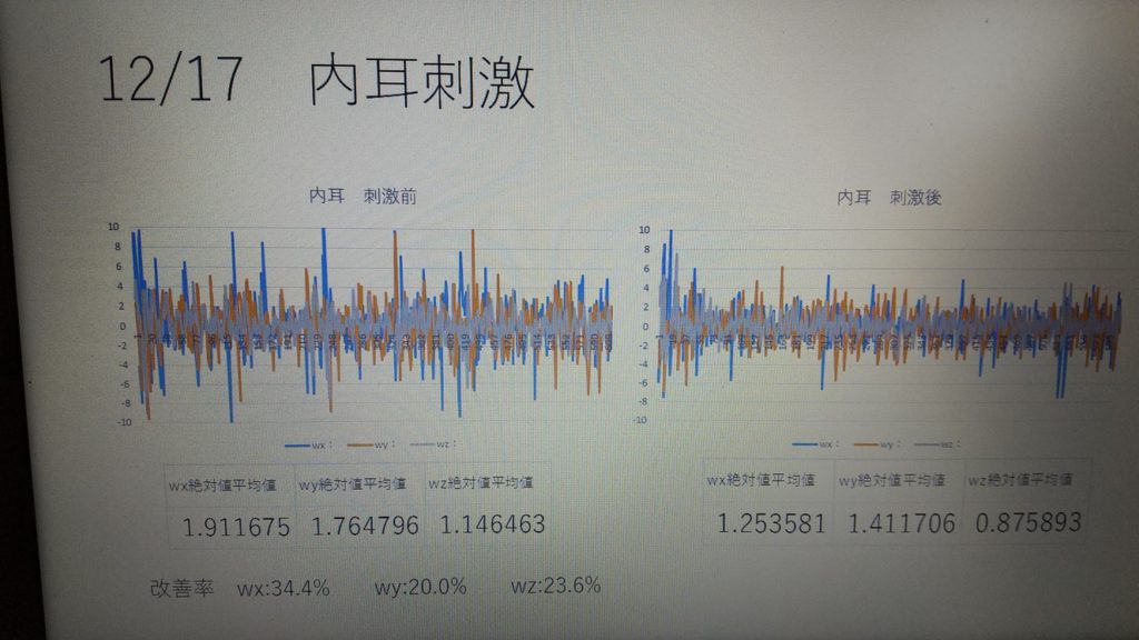 こんな感じのグラフになるのですが、グラフの線が大きければ大きいほど体の揺れが大きいということです。画像の左側のグラフが「無刺激」、右側が「耳たぶ際をローラーはりで刺激した場合」です。右側の方が体の揺れが少ないことがグラフを見ただけでもわかるかと思いますが、これを改善率にしてみると20%から34%ほど改善しているんです。これは、耳たぶ際を片側5分、ローラーはりで刺激した場合のデータです。