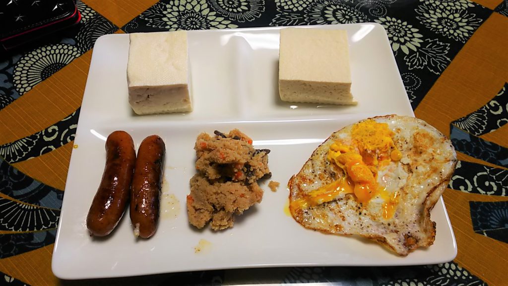 昨日の私の朝食です。卵焼き、おから、ソーセージ、冷奴2つ、写真には写ってないですが、マフィン1つ。