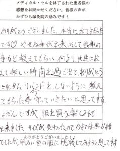 そして、徐々にですが体に変化が表れ始め、ご本人もそれを感じ始めたころ・・・「細身の服を着てみたい」「明るい色の服を着てみたいなぁ」と、それまでは悩みを抱えられていたのが希望へと変わり始めたんです。私も嬉しくなり、施術にもより一層力が入りました。